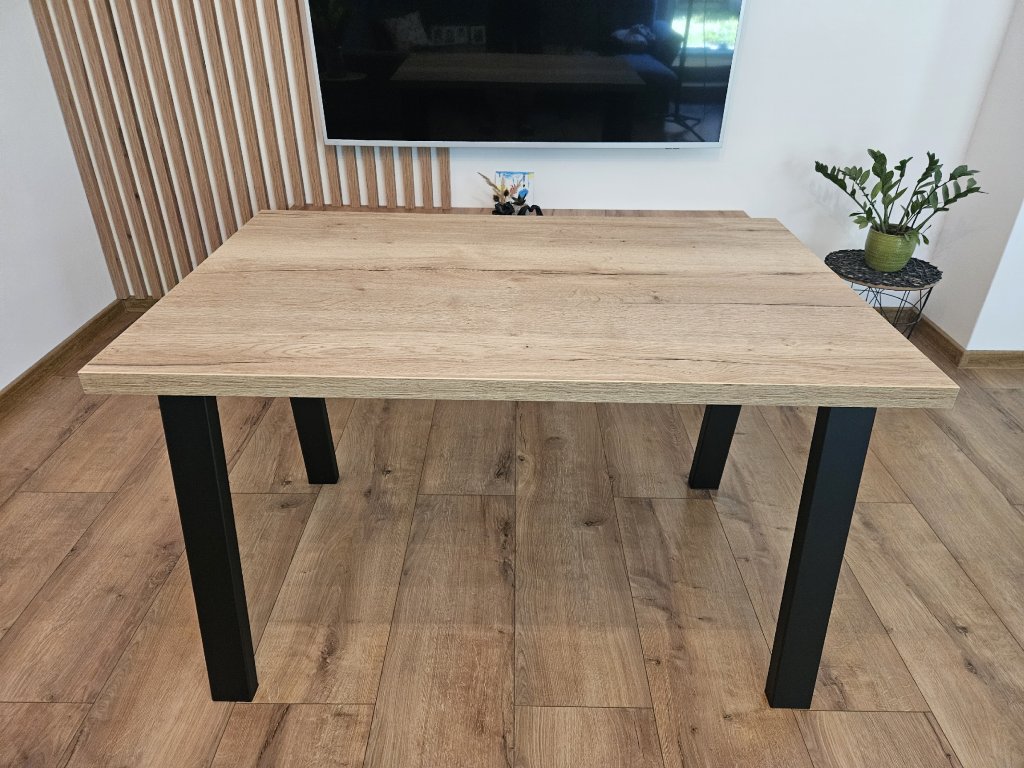 Jedálenský stôl Zlatý dub s rozmerom 125x80 a s hrúbkou plátu 36mm. Stôl ma jednoduchý a moderný dizajn. Nohy stola sú mierne zošikmené. Doska stola je z laminovanej drevotriesky a je olepená 2mm abs páskou, pričom používame kvalitné polyuretánové lepidlá, ktoré sú odolné vode. Stôl má pevnú kovovú podnož čo zaručuje maximálnu a dlhodobú pevnosť stola. Nohy sú v čiernej matnej farbe a rozmer profilu nôh je 8x4cm, s hrúbkou steny 2mm. Plát stola je zo spodnej strany biely vďaka tomu vám vieme ponúknuť lepšiu cenu. Tak ako všetky naše stoly aj tento stôl vznikol s dôrazom pre detail a tuhosť. Rozmery stola sú (DxŠxV) 125x80x78. Priestor pre stoličky je 103cm.