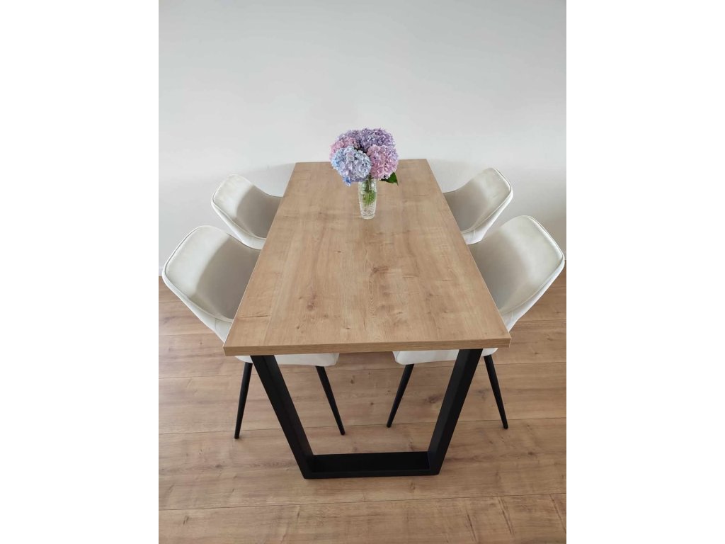 Jedálenský stôl Tyee ma nohy v tvare lichobežníka. Podnož stola je pozváraná z pevných oceľových profilov s hrúbkoou steny 2mm a s rozmerom 80x40mm. Ako povrchovú úpravu sme zvolili kvalitnú antikoróznu farbu v odtieni 9005 - čierna matná.